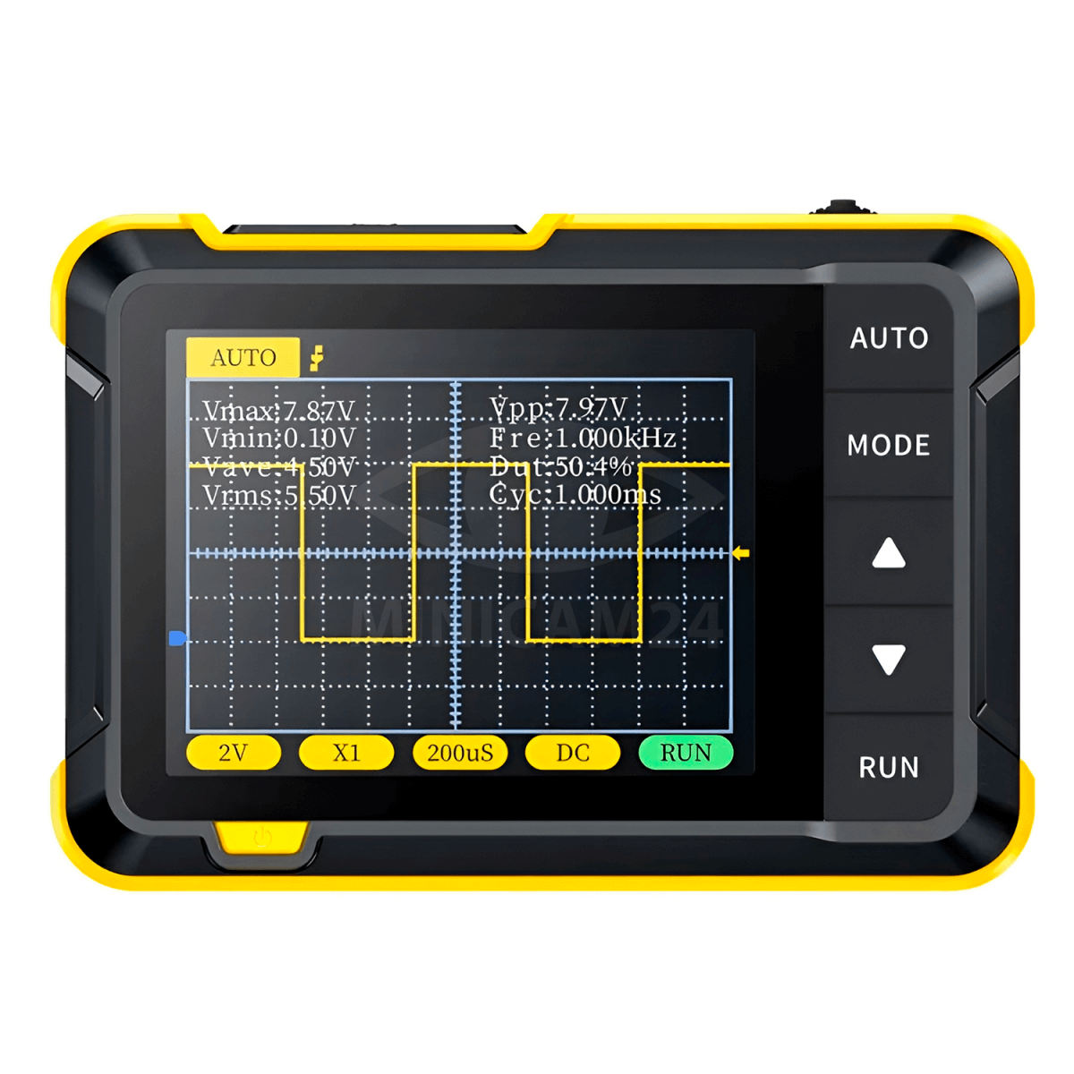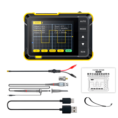 Этот цифровой осциллограф имеет компактные размеры, цветной дисплей 2,8 дюйма, частоту дискретизации в реальном времени 2,5 МС/с, полосу пропускания 200 кГц, полный набор функций запуска (одиночный, нормальный, автоматический), как для периодических аналоговых сигналов, так и для нерегулярных. можно свободно использовать периодические цифровые сигналы, поддерживать переключение между режимом запуска по переднему фронту и режиму запуска по заднему фронту, поддерживать измерение сигнала напряжения до ±400 В.
